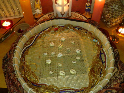 *Uma forma bastante comum do jogo de búzios é a que utiliza uma peneira como base. Esta peneira estará coberta por um pano branco, em redor da peneira deverão ser colocadas as guias, que são colares de contas com as cores dos Orixás, formando um círculo, no seu interior poderá conter outros objetos, que complementam a magia, moedas, pedras e outros amuletos que representam os Orixás.
