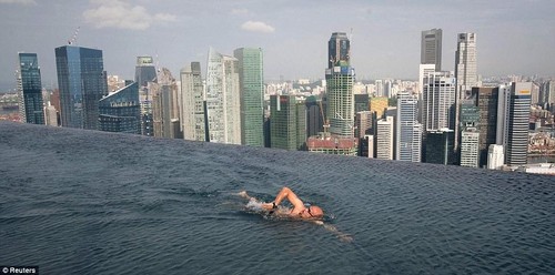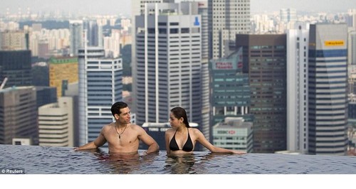 Se quer dar um mergulho nesta piscina, é melhor gostar das alturas... fica no 55º andar! Mas nadar na beira desta piscina não é tão arriscado quanto parece. Enquanto a água da piscina “infinita” parece terminar num despenhadeiro, na verdade escorre para uma espécie de canal, de onde é bombeada de volta para a piscina principal. Tem três vezes o tamanho de uma piscina olímpica (150 metros de comprimento), é a maior piscina do mundo ao ar livre, nestas alturas.